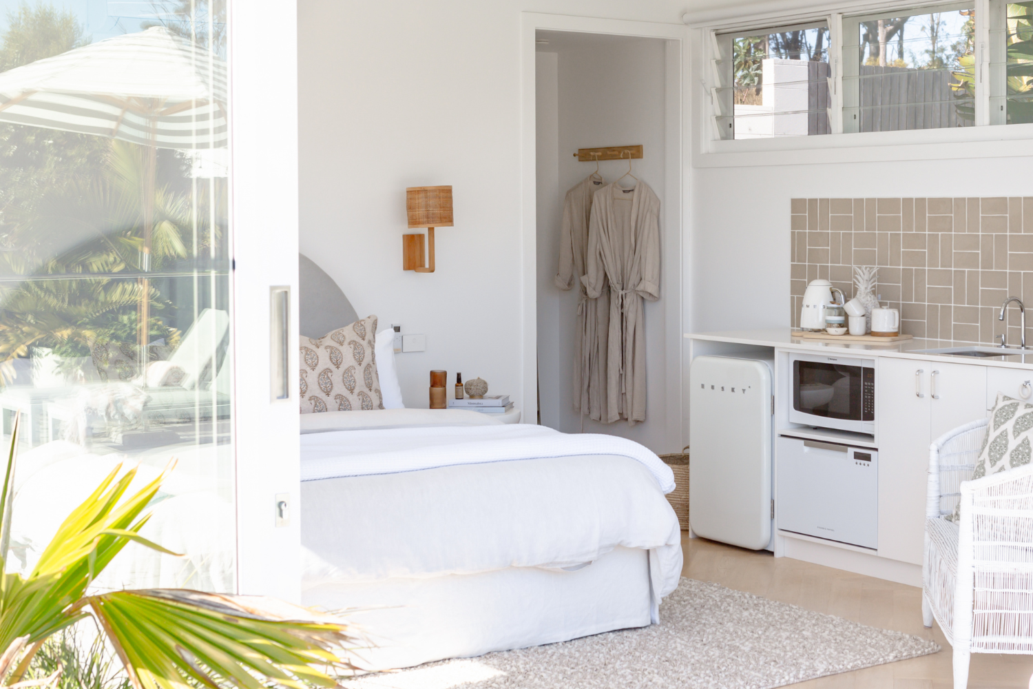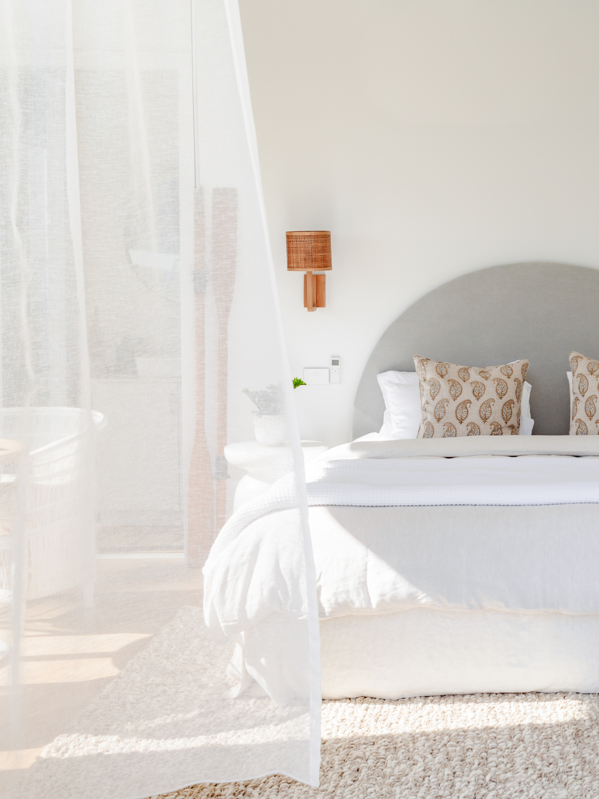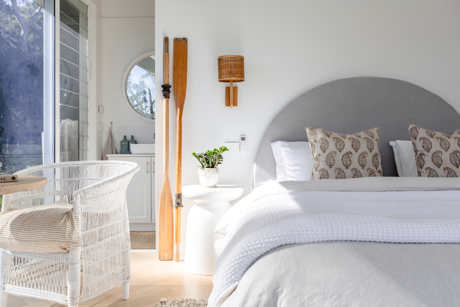 With this outlook in mind, Josie wanted to tap into this feeling of ultimate relaxation... A soft colour palette consisting of whites, beige, natural rattan, greens and blues to reflect the nature in the surrounds.