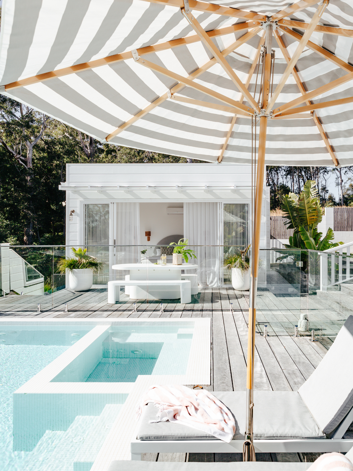 The Poolhouse Port Stephens is a luxury Airbnb located in Corlette. It is a unique space overlooking a heated mineral pool and spa, golf green, the stunning ocean and bush views.